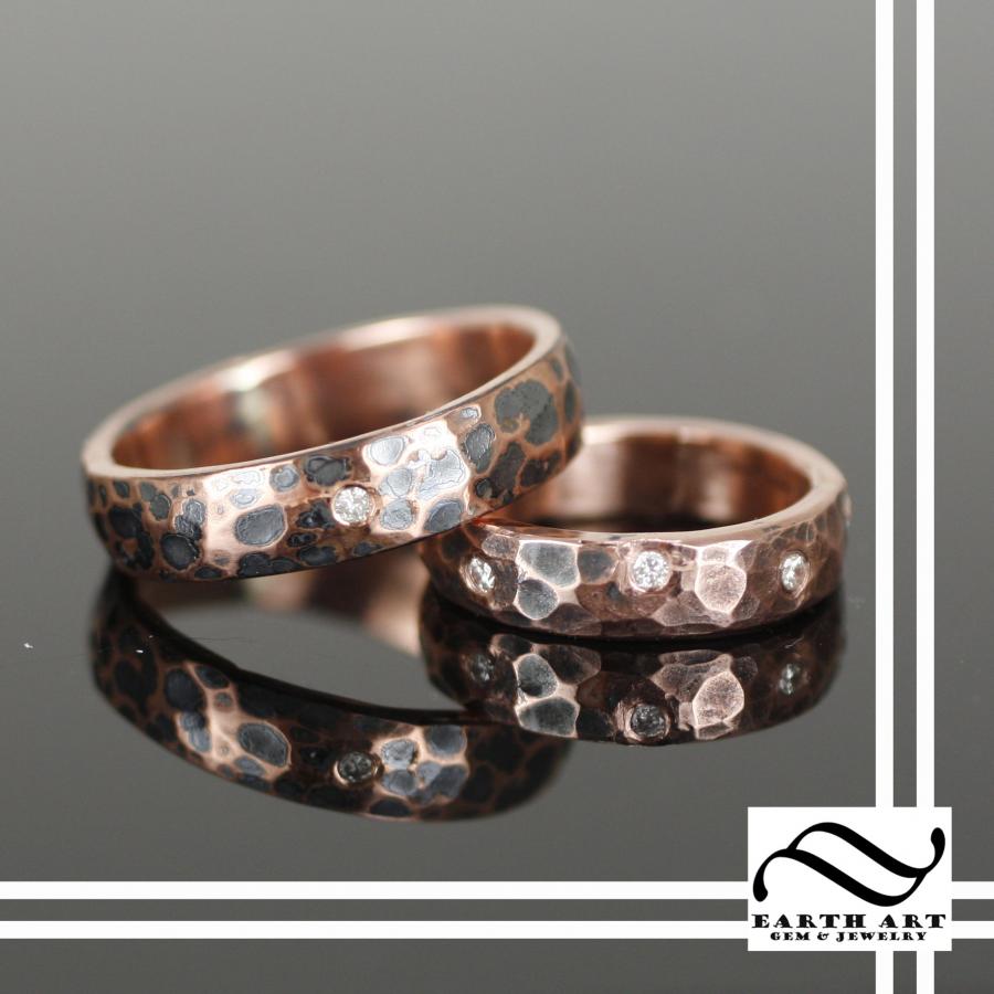 Hammered Copper & Diamond Wedding Set
