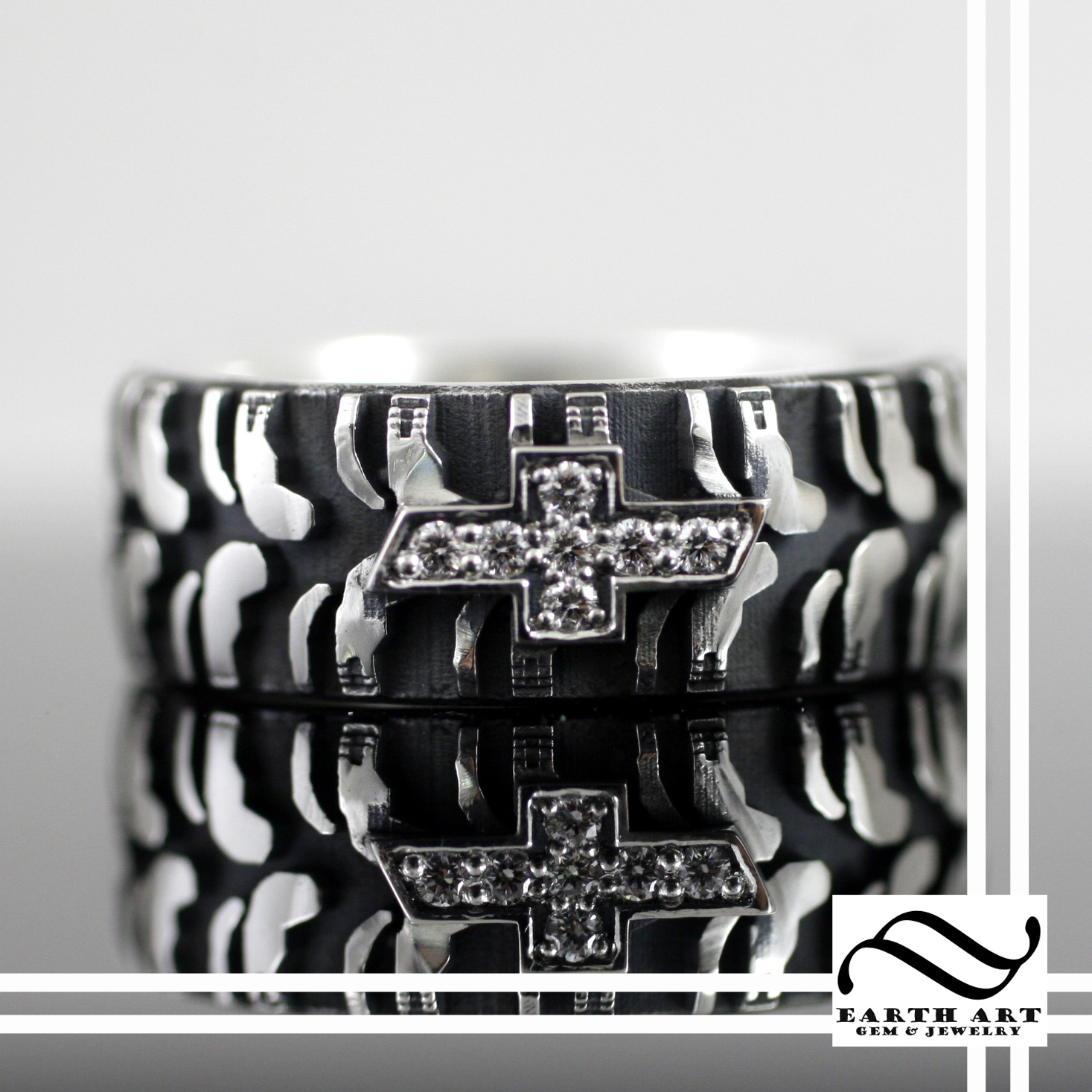This ring uses my original mud bogger tire tread design and features the chevy bowtie adorned with natural diamonds. Crafted in sterling silver and oxidized to show off the details.
