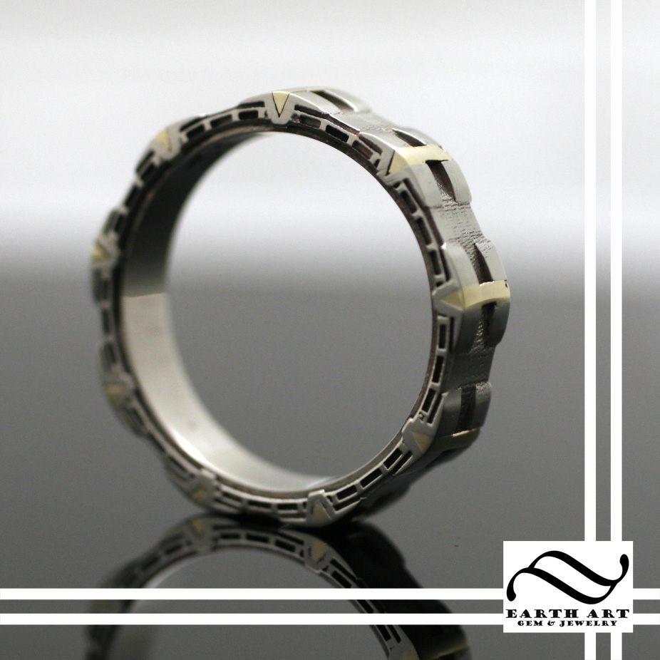 This ring was crafted in white and yellow gold. The customer wanted the triangles on the stargate to stand out from the rest of the ring so this added an additional layer of complexity to the ring with almost a dozen extra parts to assemble but the result was well worth the time.