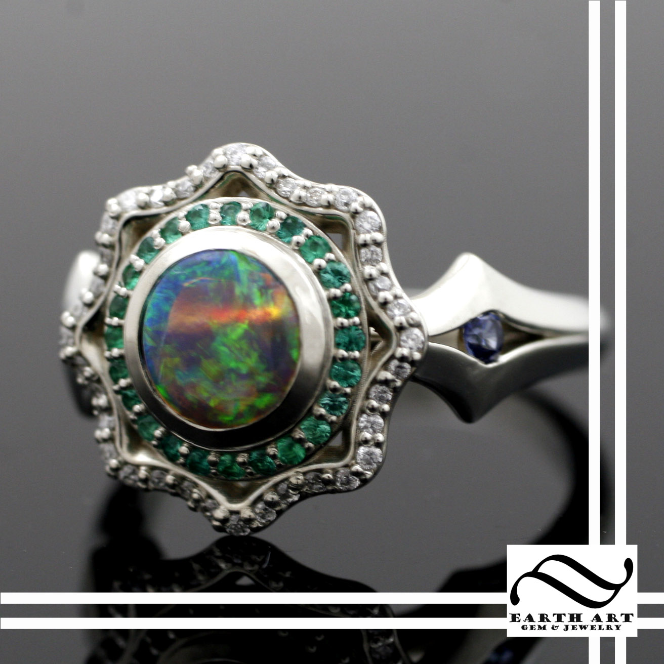 This was a wonderful custom opal ring using a solid Australian crystal opal emeralds diamonds and sapphires. Made in solid 14k white gold.