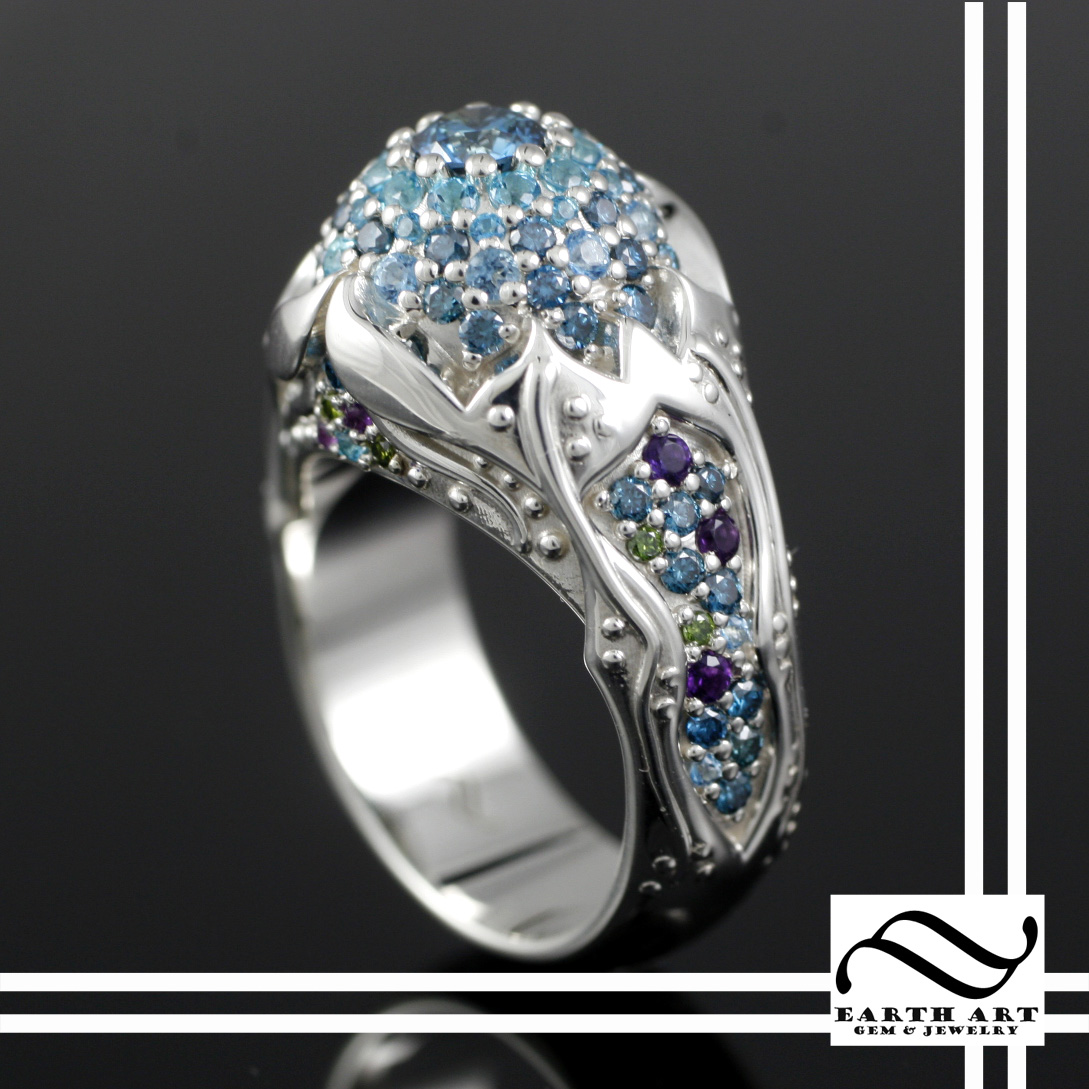 This custom ring is truleyone of a kind! Crafted to look like a jellyfish floating in the sea it features varios gemstones and blue diamonds.
