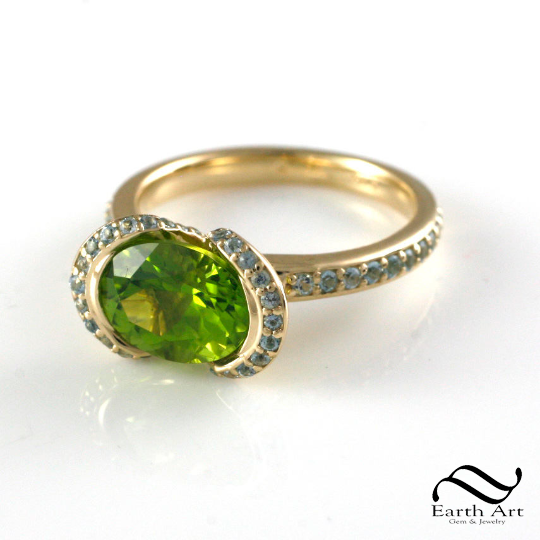 A fun ring, with a larger natural Peridot, mined in Arizona, and set in this beautiful 14k yellow gold ring with aquamarine.