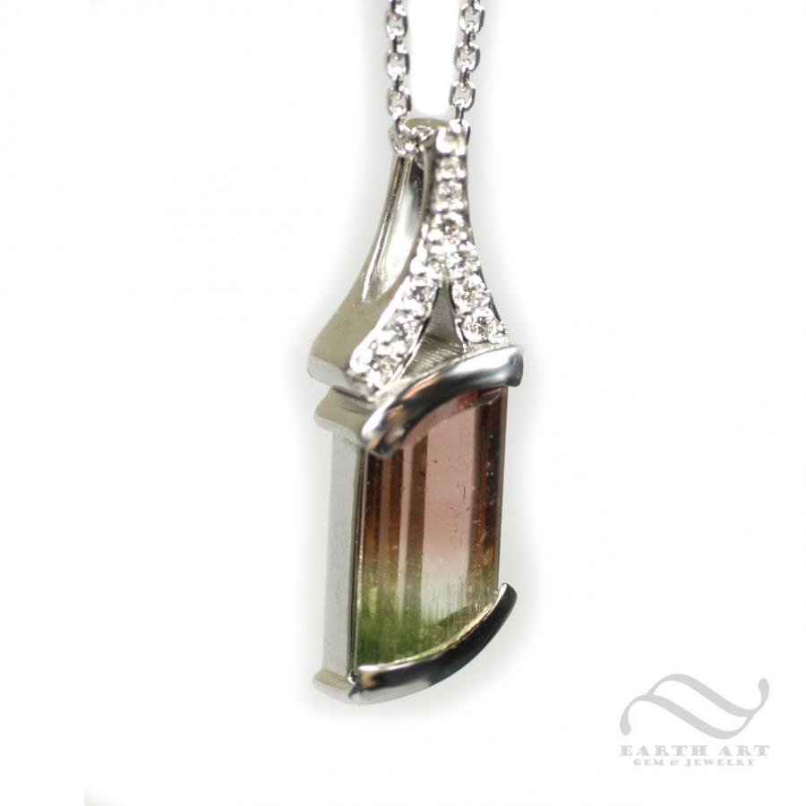 Bi colored tourmaline, also known as watermelon tourmaline is known for its beautiful pink and green color. These natural stones are rare and in high demand, especially cleaner stones like this one, in its unique designer cut.
